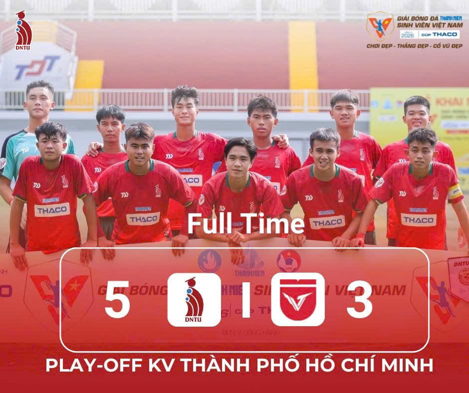 Khép lại trận play-off giàu cảm xúc và kịch tính, đội bóng Trường Đại học Công nghệ Đồng Nai (DNTU FC) đã xuất sắc giành chiến thắng 5–3 trước Trường Đại học Văn Lang (VLU), qua đó chính thức đoạt vé tham dự Vòng Chung kết Giải bóng đá Thanh Niên Sinh viên Việt Nam – THACO 2026, diễn ra tại thành phố biển Nha Trang.